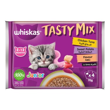 Whiskas Tasty Mix of Chicken Tuna, Sweet Potato Flavour in Gravy Food for Junior Cat, 2 to 12 Months, 70g Pack of 4