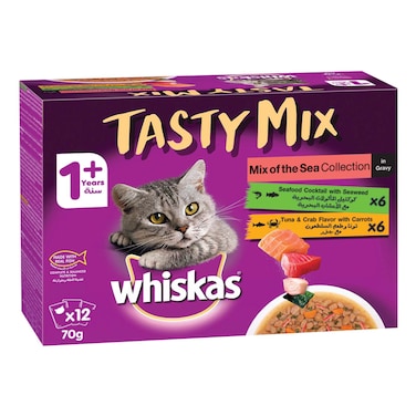 - WHISKAS TASTY MIX MIX OF THE SEA COLLECTION IN GRAVY: It consists of a mix of 12 pouches of Cat Wet food 70g each. 6 Packs of Seafood Cocktail with seaweed and 6 pouches of Tuna and crab flavor with carrots.