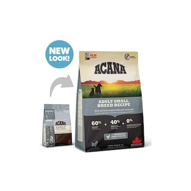 Loaded with fresh free-run chicken, whole nest-laid eggs, wild Pacific flounder and fresh sun-ripened vegetables and fruits, ACANA ADULT SMALL BREED is loaded with goodness and taste to promote peak conditioning and a healthy appetite in all small breed dogs.