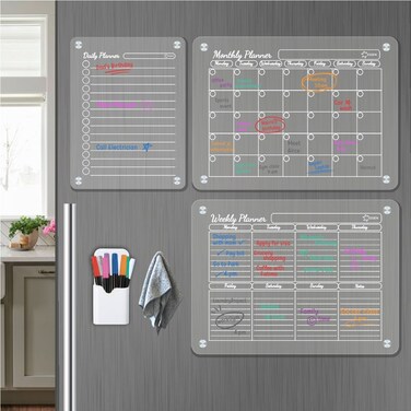 ESSEN Acrylic Magnetic Monthly Weekly Daily Calendar Planner for Fridge -Set of 3 planner, 8 markers, 1 towel eraser