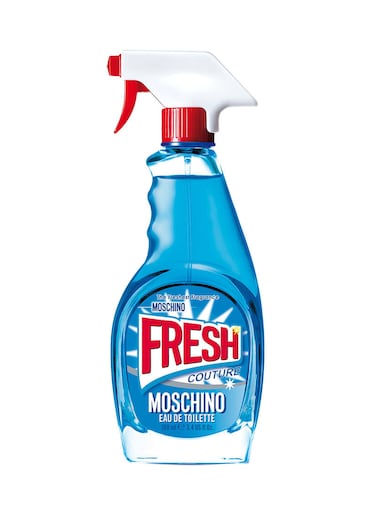Moschino Fresh Couture, inspired by the spring fashion collection. The concept for this fragrance was to juxtapose the most mundane and commonplace of all products, the household cleaner, with something so precious as the juice of a luxury brand's fragrance. Taking the iconography of a bottle that has no aspirational value and using it as the inspiration for a vessel to contain something so luxurious and haute couture, creates the ultimate dichotomy of high and low. What could be more Moschino than that? A surprising and ironic product, Fresh Couture fragrance plays with fresh and joyful accents. Its sparkling top notes of mandarin and bergamot are enriched with exotic ylang-ylang. Juicy raspberry provides contrast to the floral heart of velvety white peony and osmanthus. The base underscores the refined and modern character of the perfume with accords of clear woods, white patchouli, and ambrox.
