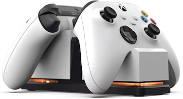 Charge or display your Xbox Wireless Controllers with the PowerA Dual Charging Station that eliminates the need for replacement batteries. Included are 4 battery doors (2 for Xbox Series X S / 2 for Xbox One) and 2 x 1100 mAh rechargeable batteries for up to 40 hours of gameplay*. To charge, simply click controller down on the Charging Station and monitor for LED color change from amber to white. When fully charged, click up to store. Focus on the game and not on your battery life.