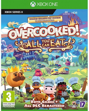 Overcooked!, Overcooked! 2 and all additional content are blended together and remastered in this delicious definitive edition!Enjoy hundreds of levels of cooperative cooking chaos across increasingly perilous and obscure kitchens.Overcooked! Goes OnlineFor the first time ever, online multiplayer has been fully integrated into Overcooked! Revisit your favourite kitchens from the first game in stunning 4K and ONLINE!A Visual Feast!Both games have been taken to the next level with stunning, enhanced 4K visuals - this is the best that the Overcooked! series has ever looked.Tasty New Content!New levels, new chefs and new mayhem - all exclusive to Overcooked! All You Can Eat.Multiple Modes!Players can enjoy campaign, survival and practice modes, and new to All You Can Eat - assist mode! Assist mode offers a number of options to allow for a less frantic game including slower recipe timeout, increased round timers and the option to skip levels.Accessible For All!Overcooked! All You Can Eat contains a features to allow as many players as possible to join in the food frenzy! Scalable UI, dyslexia friendly text and colour blindess options are all available.