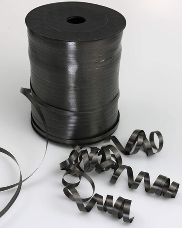 Black Curling Ribbon. Use this curling ribbon to add frills here and there! It's ideal for creating balloon strings or tying to wedding gifts, holiday packages or birthday presents! Use it to decorate at parties by putting coiled ribbons on tables or in glasses! This strong, deep crimp polypropylene ribbon is 100% waterproof. 500 yards.