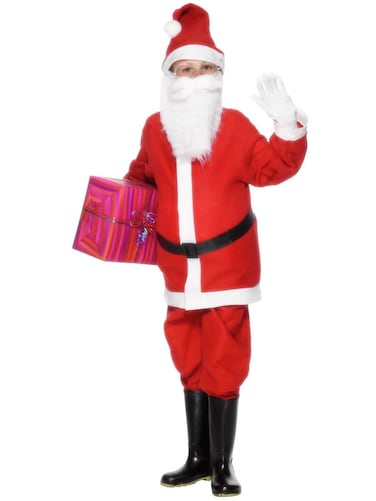 Ho-ho-ho Wish your friends a merry Christmas in the Santa Claus costume. AVAILABLE SIZES: Small: Age 4-6, Medium: Age 7-9, Large: Age 10-12. Costume Includes: Jacket, Trousers, Hat and Belt. Exclude: Beard